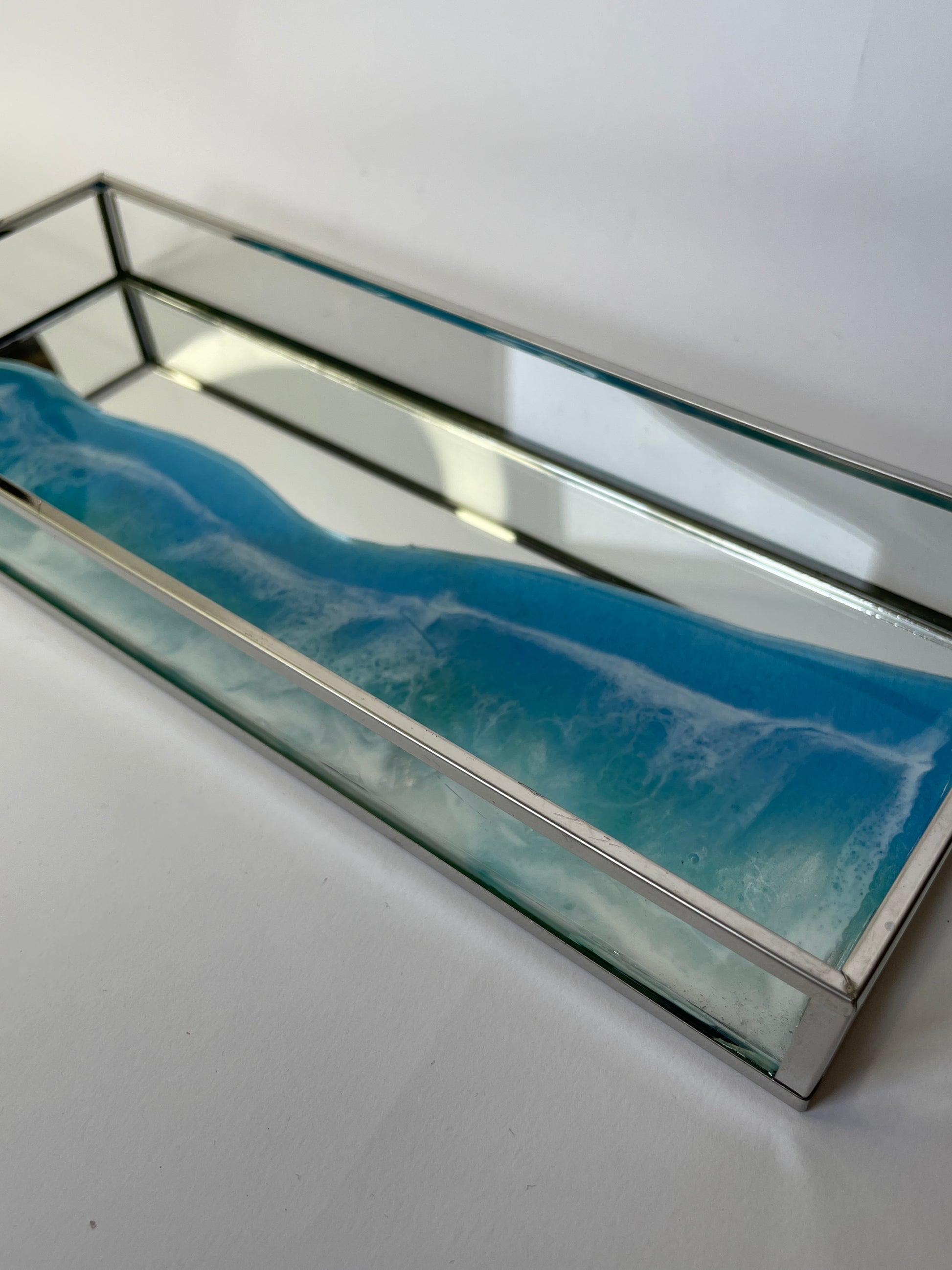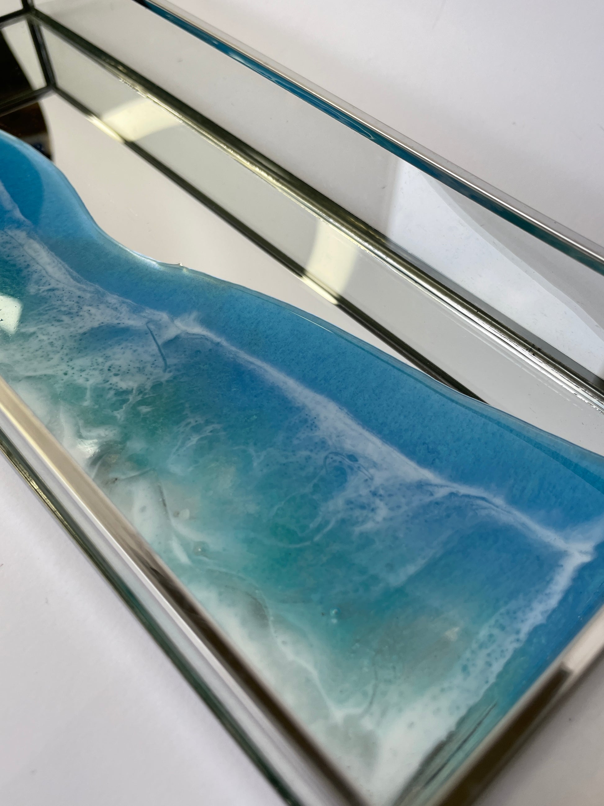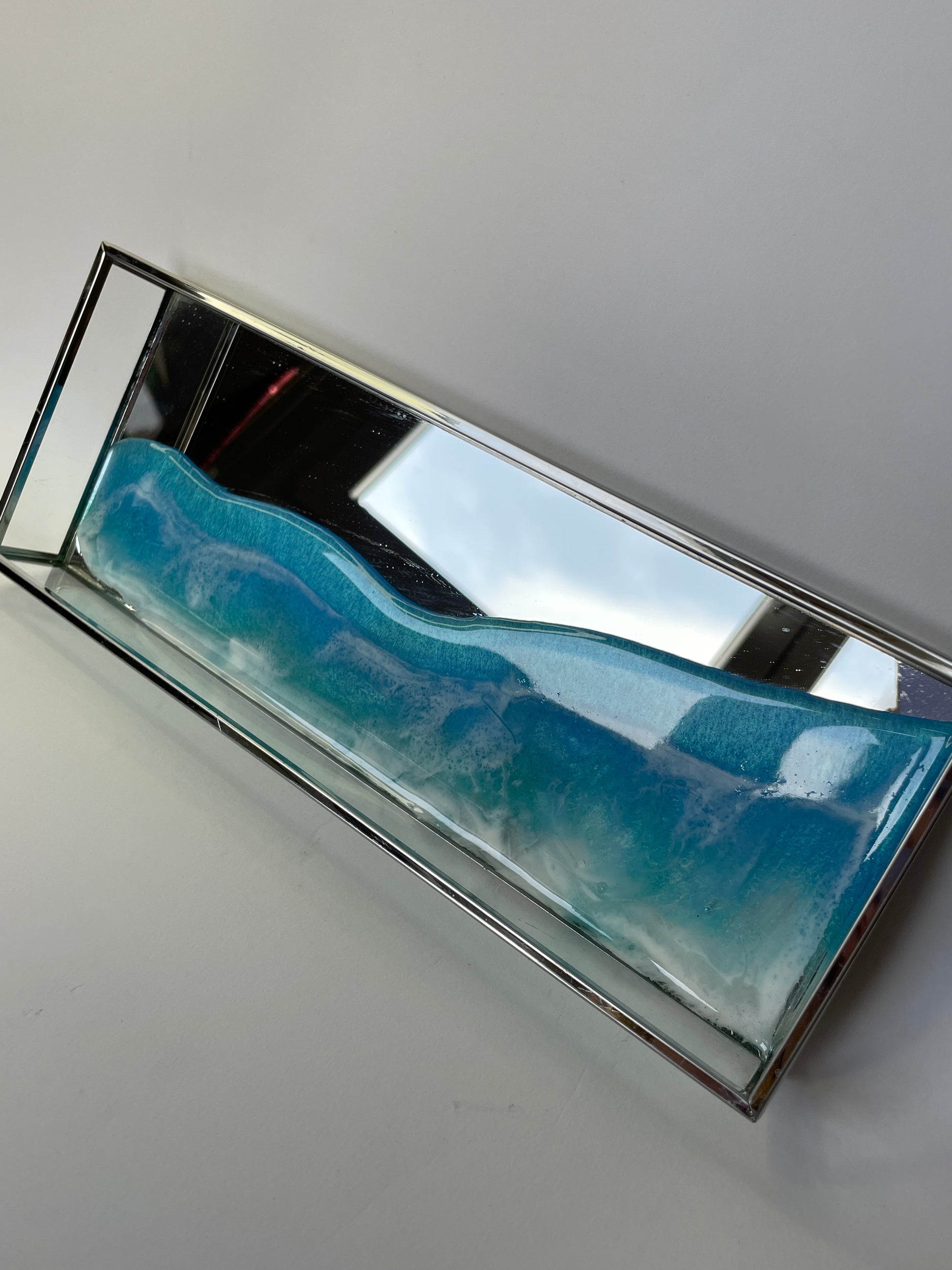 Bandeja de metal, espejo y cristal con ola en resina.