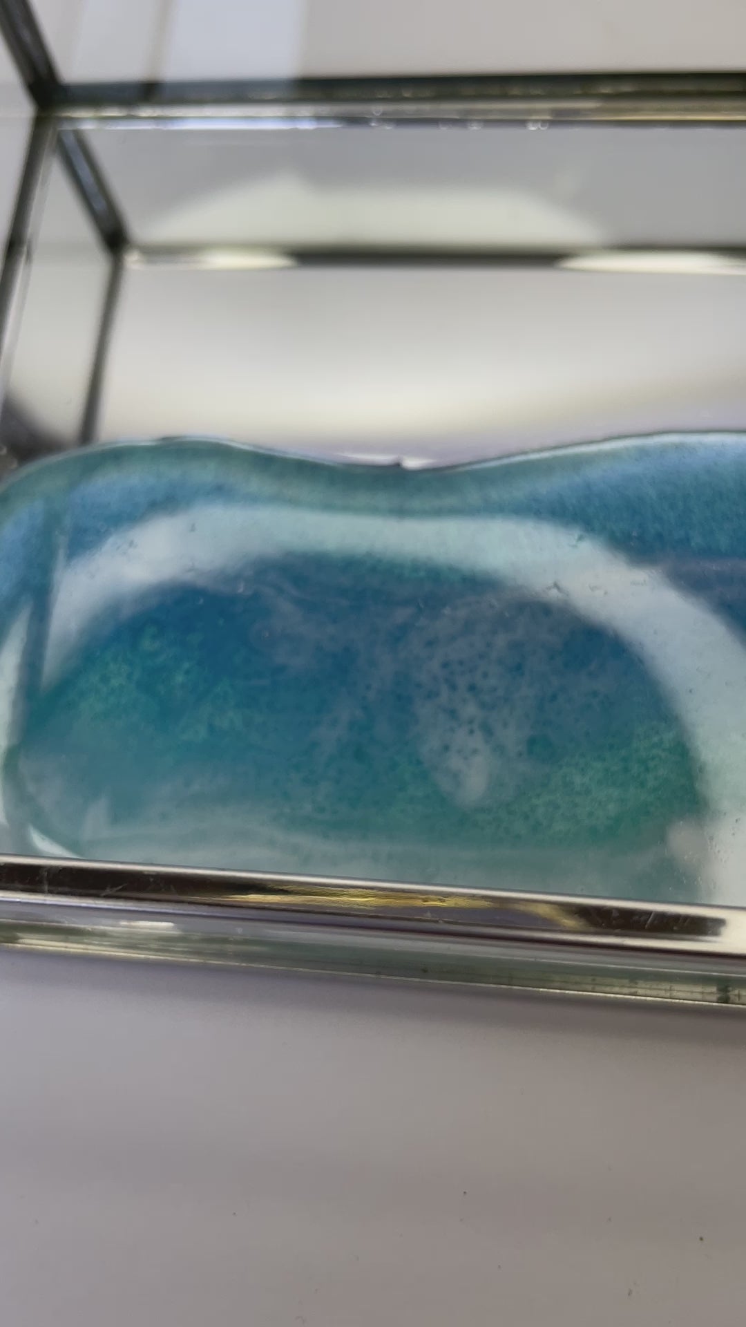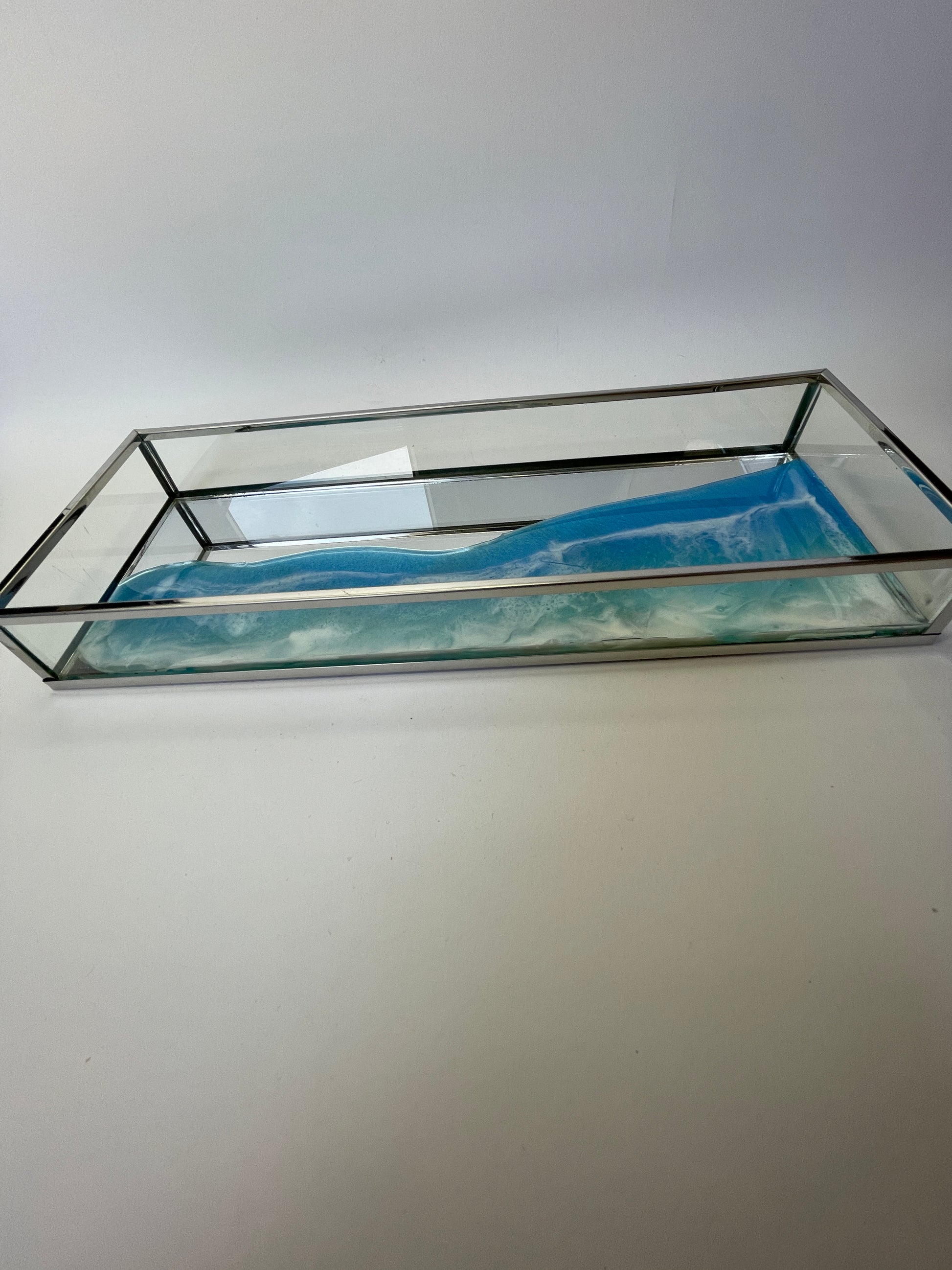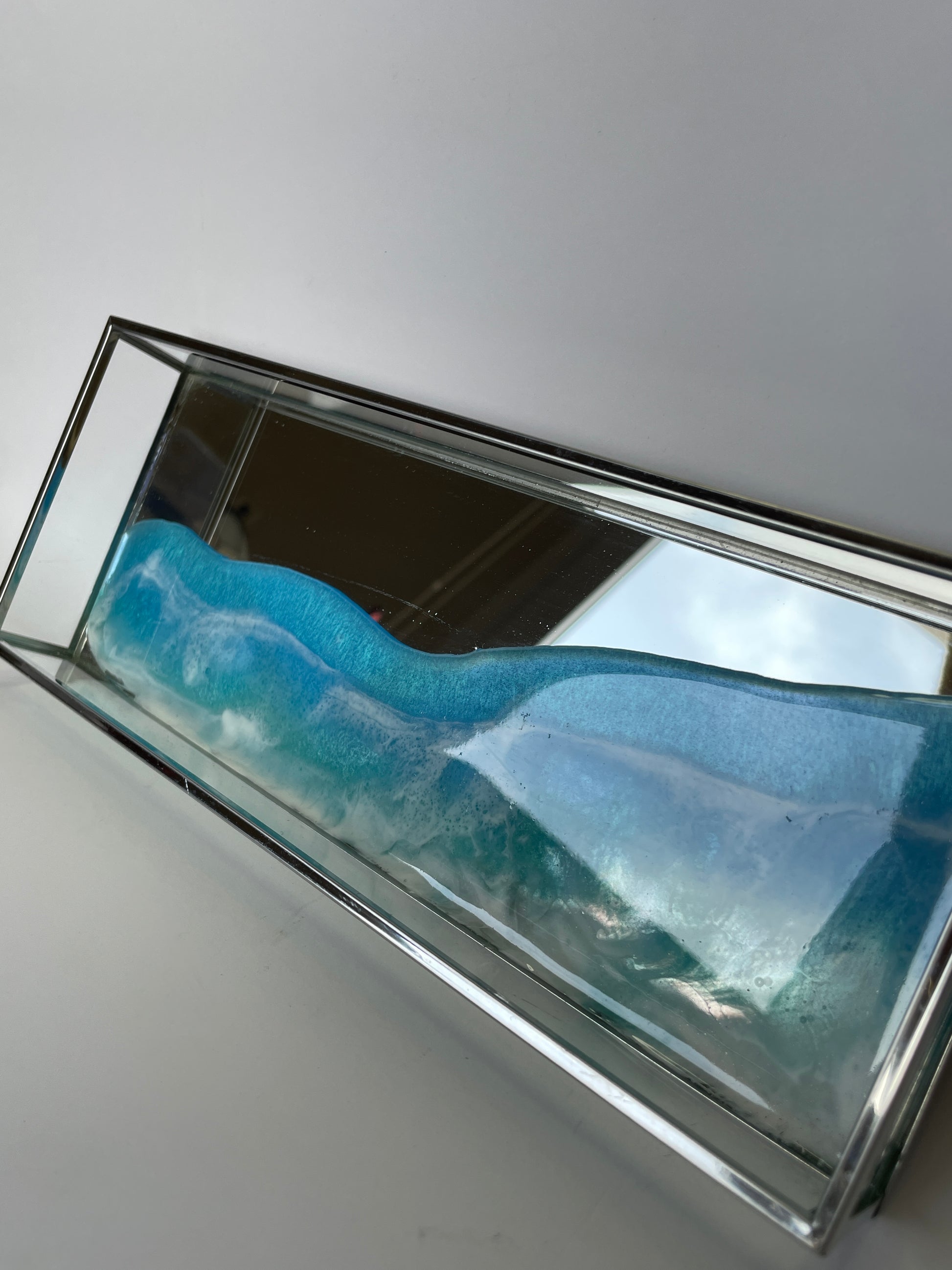 Bandeja de metal, espejo y cristal con ola en resina.