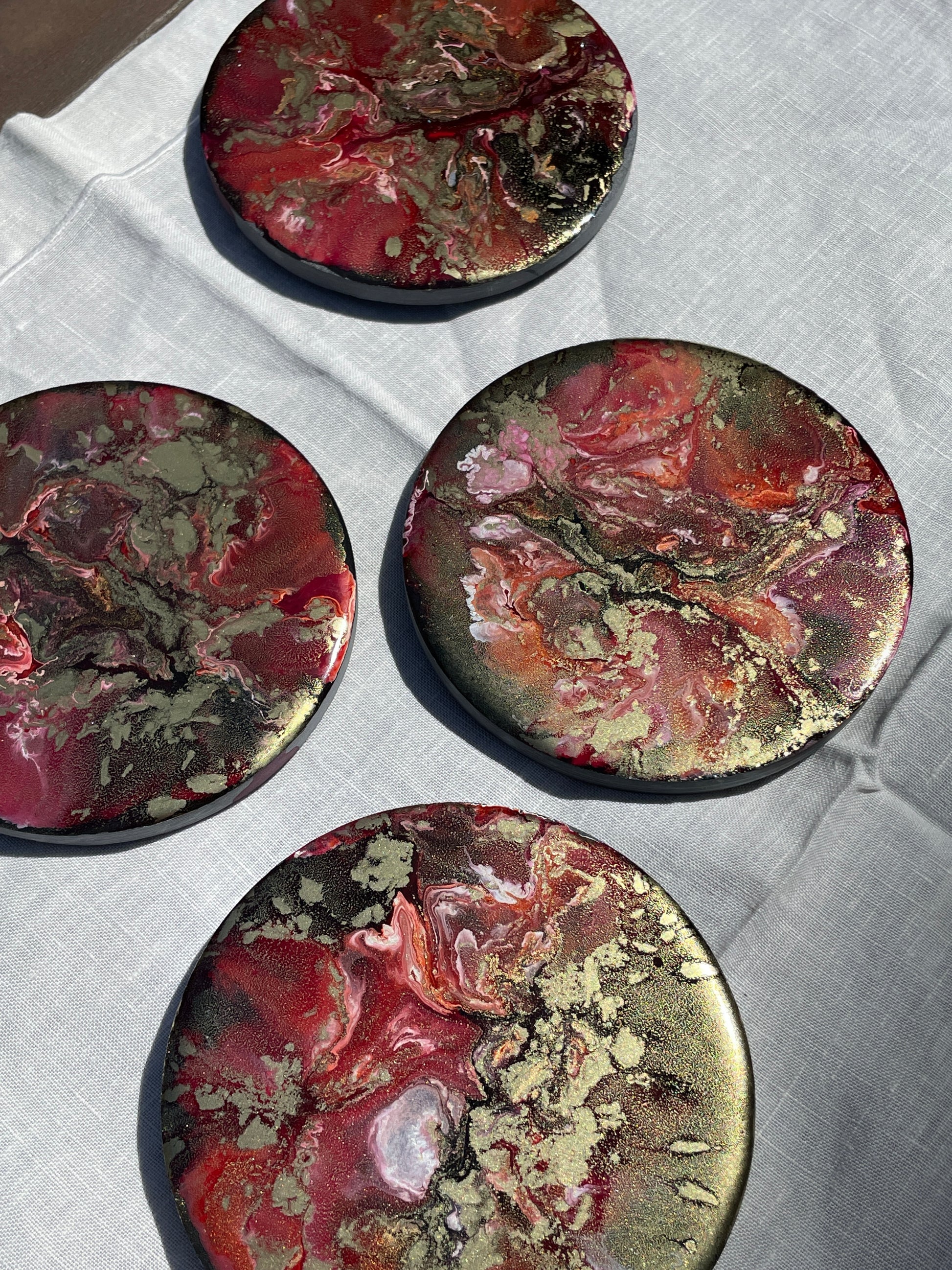 Juego de cuatro posavasos en pizarra y resina. Abstractos.