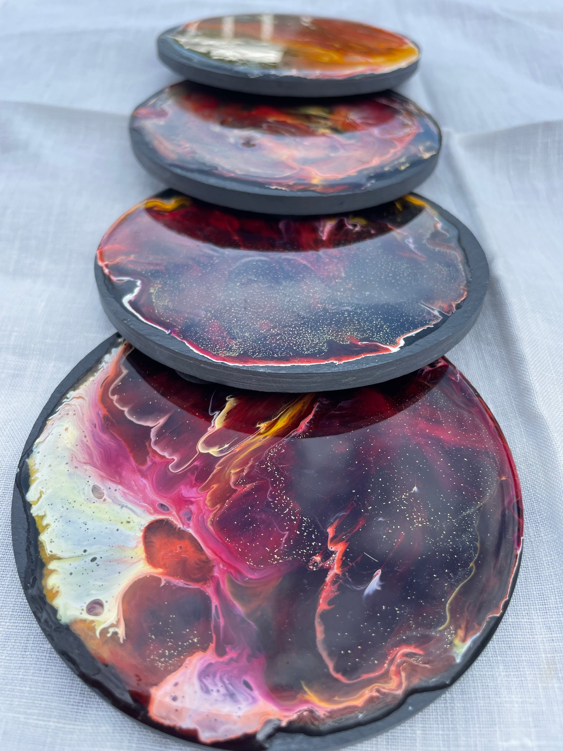 Juego de cuatro posavasos en pizarra y resina. Abstractos.